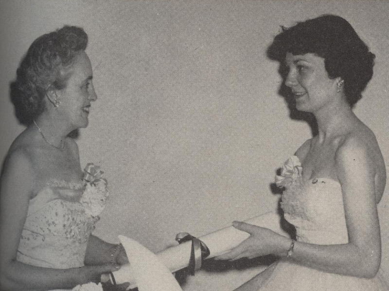 Beta Tau Chapter President Pat Johnson receiving the chapter’s charter from International Grand President Elizabeth Fee Arnold (Colorado State, 1923) in 1956.