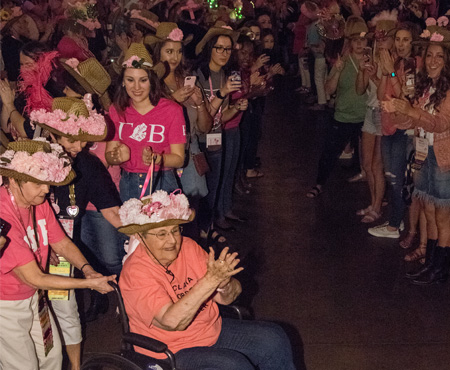 Marta Brown being pushed by Sally Lewis and Phyllis Choat – the three highest number of carnations in their hat (most Conventions attended)