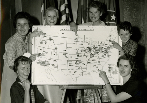 Women from “far away places” point out their homes on the map, including Honolulu, Vancouver and Winnipeg.